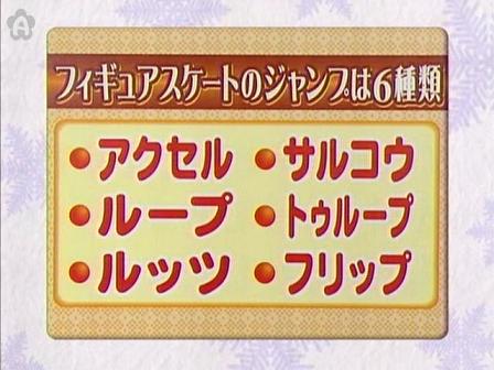 Axel (阿克谢尔跳 一般又称一周半跳) Salchow (沙霍夫跳 又称后内结环跳)